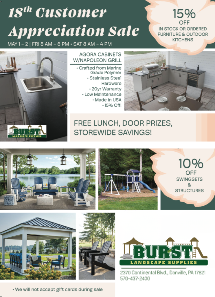 We’ve been supplying Danville, PA and surrounding areas with landscaping supplies since 2009. We carry a large variety of products and materials, if you have any questions please feel free to contact us or stop by and view our inventory. Thanks for considering Burst!